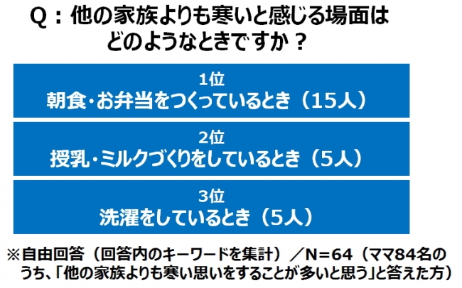 そこで、「寒いと感じる場面」を自由回答で聞くと、「朝食・お弁当をつくっているとき」(15人)、「授乳・ミルクづくりをしているとき」(5人)、「洗濯をしているとき」(5人)をあげる人が多くみられました。