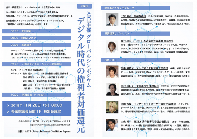 この度、アジアインターネット日本連盟(AICJ)は、2018年11月28日に参議院議員会館にて、AICJ主催 グローバルシンポジウム「デジタル時代の権利者対価還元」を実施する運びとなりました。