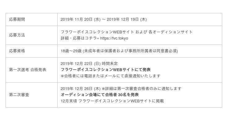 第一次 書類選考⇒第二次 オーディション審査で合格した30名は2020年1月よりライブ配信アプリ BIGOLIVE(※1)にて世界24カ国 2憶人のユーザーに向けてのプロモーション活動をする。この他、フラワーボイスコレクション実行委員会と連携の音楽制作事務所スクールにてボイストレーニング、ダンスレッスン、英会話、所作など、奨学金の貸与による(実質)全額免除にてレッスンを受ける。