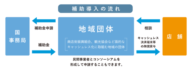 ※国・事務局への補助金申請は地域団体が行います。店舗の皆様は直接応募することができませんので、キャッシュレス決済の導入を検討される場合は、地域団体に御相談ください。