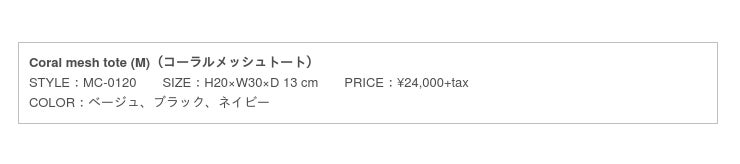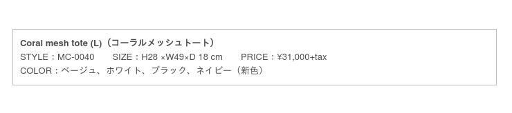 デビュー以来大好評のトートバッグ。A4ファイルやノートPCも入るサイズ感で、収納力も抜群。きちんと自立する仕様。コーラルメッシュシリーズの最大の魅力はなんと言っても見た目以上の軽さが魅力。Lサイズでも530gという極上の軽さを実現しています。荷物をたくさん入れても負担にならないのでお仕事はもちろん、ジムや習い事にもおすすめです。