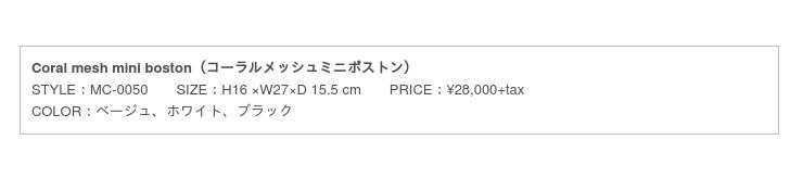 珊瑚(=coral)のような立体感と有機的なフォルムを表現した「コーラルメッシュ」シリーズ。ダブルラッセルの上にナイロン製のメッシュ素材を張り合わせたオリジナル生地は、厚みと弾力、耐久性を備えながら、極上の軽さを実現しています。スポーティーな佇まいを、付属の牛革やモダンなデザインによって、上品に仕上げました。本体から曲線を描きながら繋がる一体型のハンドルがエレガントなデザイン。底鋲がついていて、きちんと自立する仕様。 エターナルなシルバーカラーの焼付塗装を施したアイコニックな真鍮金具と、オリジナルで作ったストライプ柄のライニングもポイント。