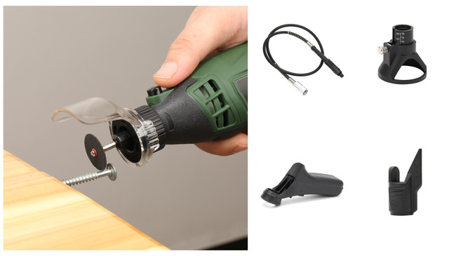フレックスシャフト、ディテーラーグリップ、シールドアタッチメント、カッティングガイド、アタッチメントが付属しており、狭い箇所での作業や暗所での作業、火花が出る作業での安全性の確保、正確な作業などに活躍します。