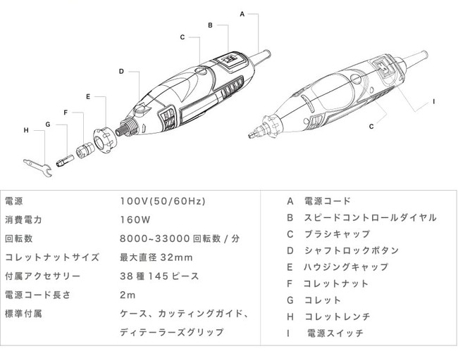 143個のビットが付属しており、研磨、穴あけ、サビ落とし、ガラス彫り、陶芸彫刻、木材加工、金属加工などが行えます。