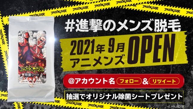 アニメンズOPENを記念し、抽選で10名様に進撃の巨人デザインオリジナル除菌シートが当たるTwitterキャンペーンを開催いたします。