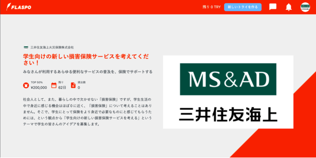 現在、学生向けアイデアコンテストプラットフォーム「FLASPO」にて、MS&ADインシュアランスグループの損害保険事業を担う三井住友海上火災保険株式会社における、学生向けコンテストを開催しております。