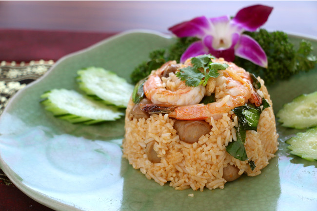 プリプリの海老とフクロタケに、バイマックルー(こぶみかんの葉)が香る当店オリジナルのチャーハンとなります。国内でお召し上がりいただけるお店は少ないのと、タイで親しまれている国民食をアレンジしたこちらの商品、当店にいらっしゃる“タイ通”の方々が必ずオーダーされる一品です。
