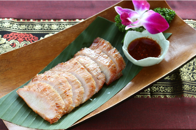 豚トロ肉の厚い脂を削ぎ落とし、余分な脂っこさがない肉の旨味と食感を活かす丁寧な下処理をしたうえ、秘伝のタレで漬け込み焼き上げた一品。専用のつけタレも付属しています。辛くなく、クセもないので日本人に人気のタイ料理です。