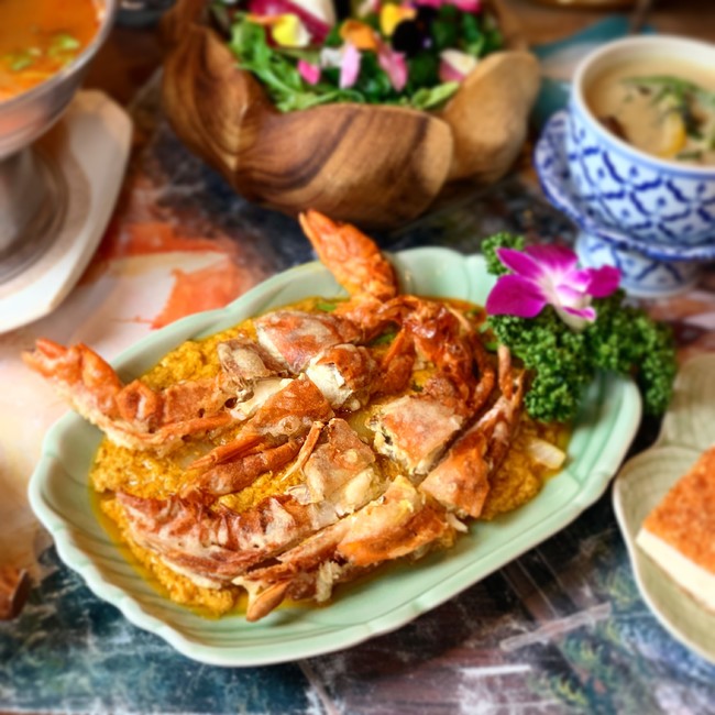 “プーパッポンカーリー”の名称で有名なタイ料理。ソフトシェルクラブ(脱皮した蟹)バージョンです。なかなか他店では見る事のない「ジャンボサイズ」の蟹が丸ごと2杯入っています。手も汚さず蟹の旨味を丸ごと味わえるこちらも大人気の一品です。当店のパッポンカーリーは辛さが無いため、お子様を中心にご家族みなさんで美味しく召し上がっていただけます。