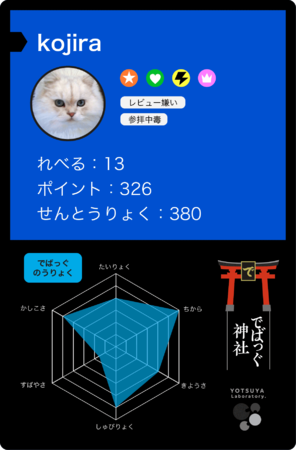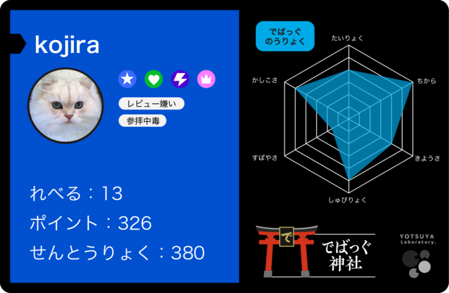 町のオープンラボ「四谷ラボ」の有志はこのような現状を憂い、GitHubでのコントリビュートのようなオープンソースへの貢献をポイント化して、Web上で参拝したりおみくじを引くことができ、ゲームのステータス画面のように可視化したプロフィールなども表示できるようにすることができるオープンソースのWebサービス「でばっぐ神社」を創建した。