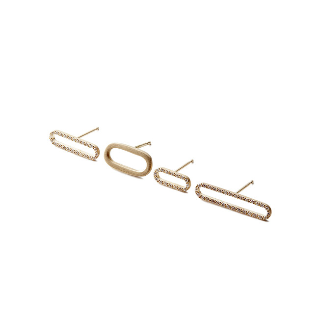 艶を抑えたマットゴールドのオーバルモチーフは、ジェンダーレスなデザインでどんなスタイルにもマッチして、モード感あるスタイルに