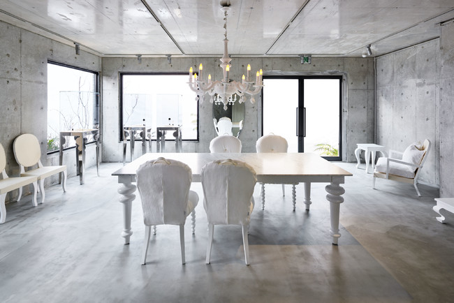 深い緑の中に淡い緑が混在し、和とも洋とも言えない、まるで小さな森に囲まれているような佇まいのBLANC IRIS TOKYOは、心躍る非日常的な空間でブランイリスの世界を体感していただけます。大きなマーブルのテーブルを照らす、セラミックでできたシャンデリア。