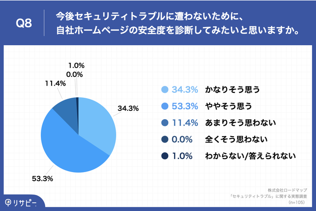 「Q8.今後セキュリティトラブルに遭わないために、自社ホームページの安全度を診断してみたいと思いますか。」(n=105)と質問したところ、「かなりそう思う」が34.3%、「ややそう思う」が53.3%という回答となりました。