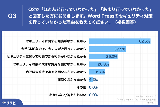 「Q3.Q2で「ほとんど行っていなかった」「あまり行っていなかった」と回答した方にお聞きします。Word Pressのセキュリティ対策を行っていなかった理由を教えてください。(複数回答)」(n=48)と質問したところ、「セキュリティに関する知識がなかったから」が62.5%、「大手CMSなので、大丈夫だと思っていたから」が37.5%、「セキュリティに関して相談できる相手がいなかったから」が29.2%という回答となりました。