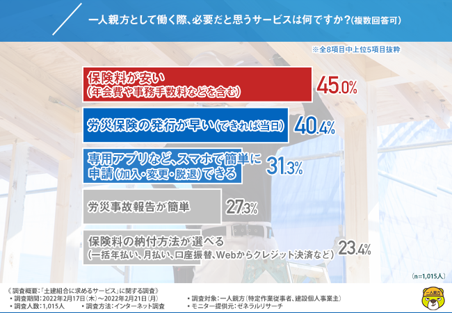 今回「土建組合に求めるサービス」に関する調査を実施した、一人親方部会グループ(https://www.saitama631.com/lp02/)は、一人親方のための労災保険を提供しております。