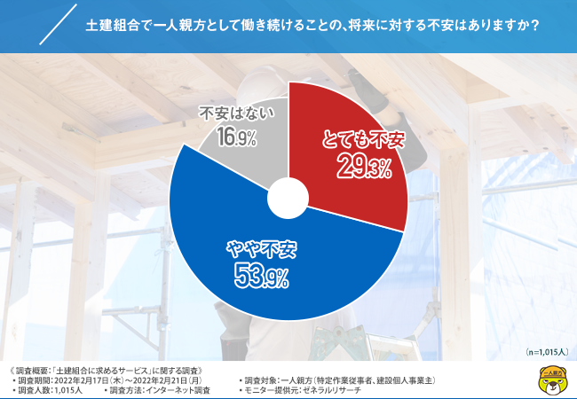 そこで、「土建組合で一人親方として働き続けることの、将来に対する不安はありますか?」と質問したところ、8割以上の方が『とても不安(29.3%)』『やや不安(53.9%)』と回答しました。