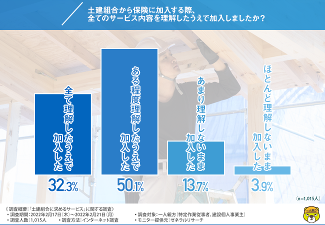 そこで、「土建組合から保険に加入する際、全てのサービス内容を理解したうえで加入しましたか?」と質問したところ、『全て理解したうえで加入した(32.3%)』『ある程度理解したうえで加入した(50.1%)』『あまり理解しないまま加入した(13.7%)』『ほとんど理解しないまま加入した(3.9%)』という結果になりました。