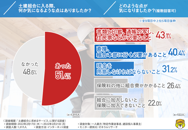 「土建組合に入る際、何か気になるような点はありましたか?」と質問したところ、約半数の方が『あった(51.4%)』と回答しました。