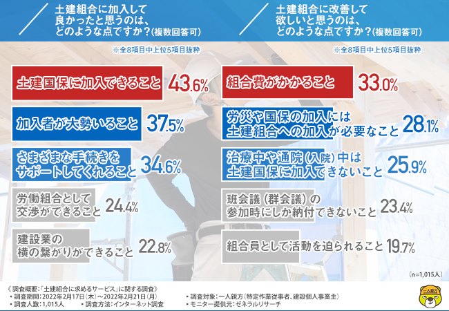 また、約4割が土建組合に加入しており、労災保険に「保険料の安さ」や「気軽さ」を求めていることも明らかになりました。