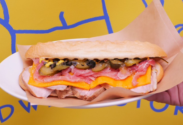 キューバンブレッドにローストポーク、ハム、マスタード、チーズ、ピクルスを挟み、バターを塗ってホットサンドでプレスした料理です。