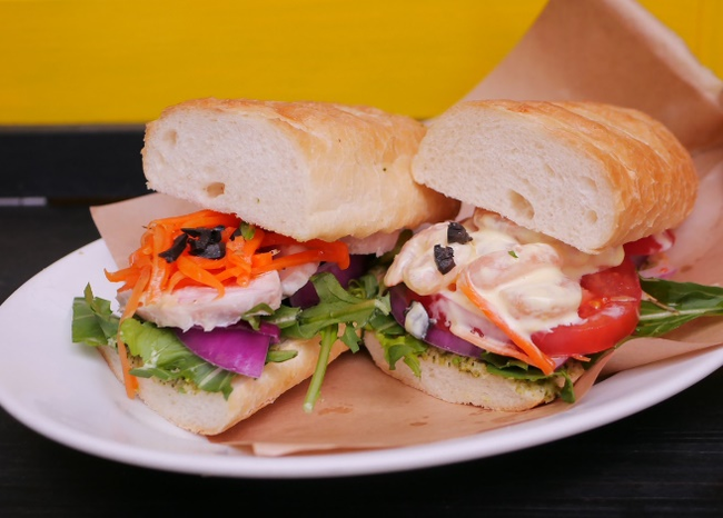 世界的に健康志向のベーカリー需要が伸びている中、当店のベジタブルサンドは1/3日分の有機野菜と1/2日分のタンパク質が摂れるバランスの良い見た目も触感も楽しめる新しいプレストサンドイッチです。メインは、しっとり柔らかい自家製の鶏ハムとぷりぷりなエビマヨの2種類の具材が楽しめます。