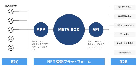 MetaBoxは主にB2CとB2Bプラットフォームによって構成されています。 B2Cは、個人ユーザーがアプリでNFT変換をして使う場所で、B2Bは法人がAPIでNFT変換及びサービスを利用するプラットフォームです。