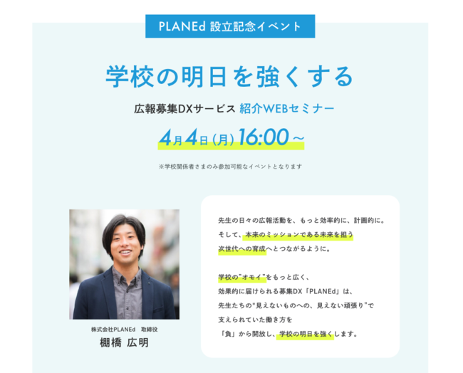 また、このたびの法人設立を記念して、2022年4月4日(月)16:00より、学校関係者様向けに、広報募集DXサービス「PLANEd」をご紹介するWEBセミナーを開催いたします。