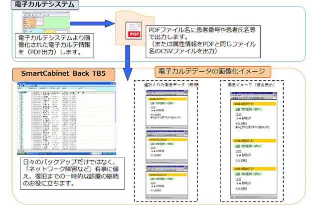 日々の電子カルテの記事情報を夜間にサーバーにバックアップを行い、電子カルテシステムがダウンし閲覧できなくても、