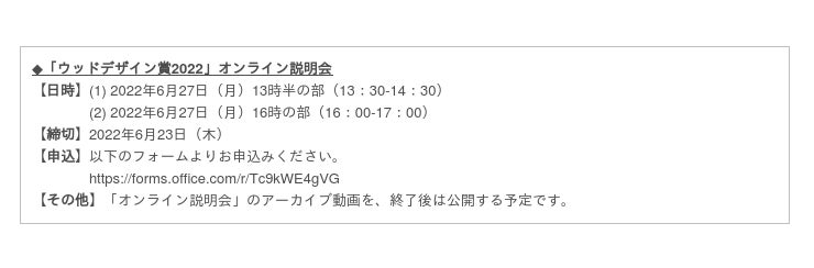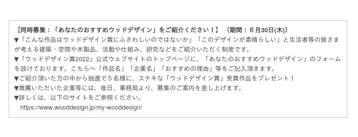 また、「ウッドデザイン賞2022」の概要、これまでのとの違い、応募に関する留意点などをご説明するため、「オンライン説明会」も開催します。
