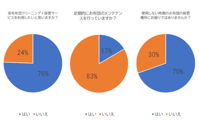 6月末に甲州羽毛ふとん?楽部会員(約2,700人)を対象に実施したアンケートでは、7割以上が「クリーニング&保管サービス」を希望しているという結果も出ており、多くのご要望をいただきました。また、8割以上が「定期的のお布団のメンテナンスを行っていない」と回答。7割が「羽毛ふとんの保管場所に困っている」という回答をいただきました。