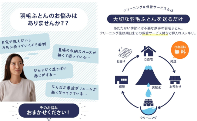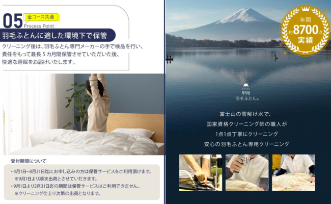 富士山の天然水で磨かれた羽毛を扱う、唯一の寝具ブランド“甲州羽毛ふとん”「クリーニング&保管サービス」羽毛ふとん専用クリーニングと最大5カ月保管できる3種のコースプランがスタート