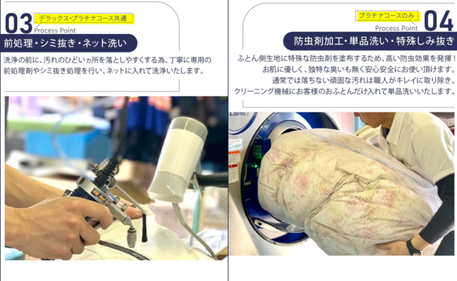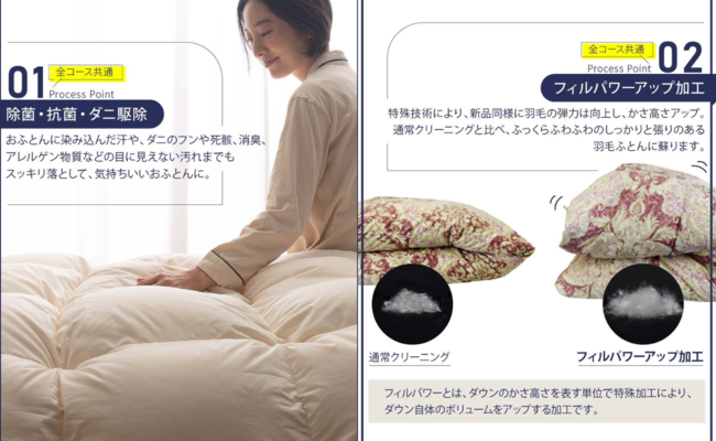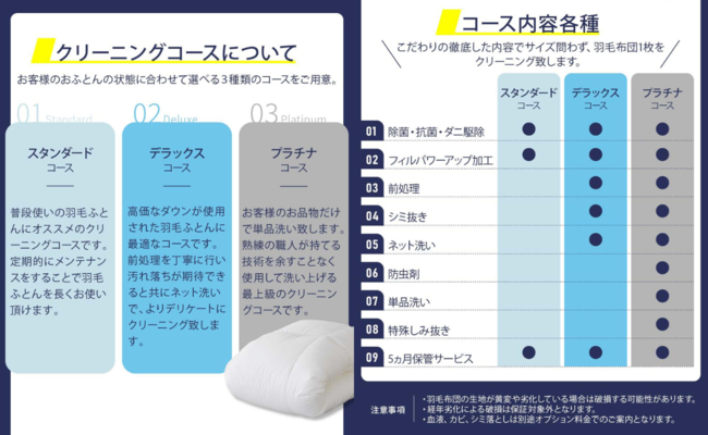 これまで甲州羽毛ふとんでは、リフレッシュ加工という羽毛ふとんの打ち直しサービスのみ提供してまいりましたが、この度の新サービスでは新しく導入した3種のクリーニングコースと羽毛ふとん専門店だからこそできる安心のお預かりサービスを、自宅にいながら簡単に利用することが可能となりました。