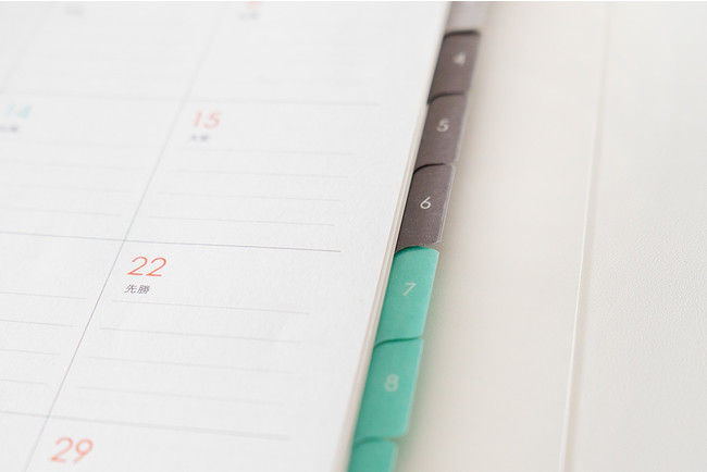 年間を通して使用してもよれない高品質。1年間、ほぼ毎 日めくる手帳に耐久性とめくりやすさを兼ね揃えたラミネ ートを施したインデックスを起用しています。