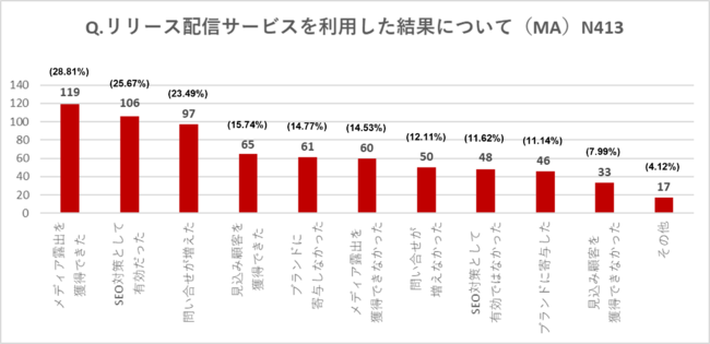 リリース配信サービスを利用したことがある413人にサービスを利用した結果を聞いたところ、回答数第1位は「メディア露出を獲得できた」で28.81%。続く第2位は「SEO対策として有効だった」で25.67%、第3位は「問い合わせが増えた」23.49%となりました。様々な理由でリリース配信サービスに効果を感じていることが分かりました。