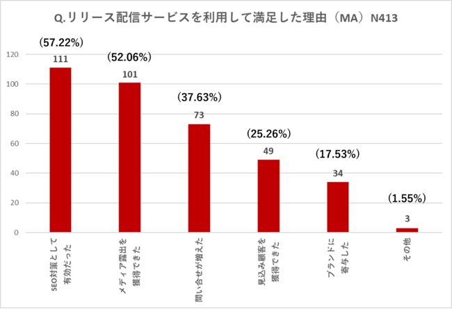 ・リリース配信サービスを利用して満足した理由1位は「SEO対策として有効」が57.22%