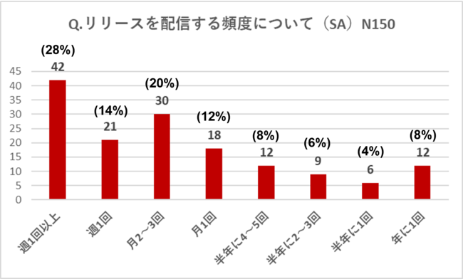 また、「メディア露出を獲得できた」と回答、もしくは「SEO対策として有効だった」と回答した人(150人)に、リリースを配信する頻度を聞いたところ、第1位が「週1回以上配信」で28%となりました。約3割が週1回以上の高ペースでリリースを配信しており、メディア露出を獲得していることが分かりました。