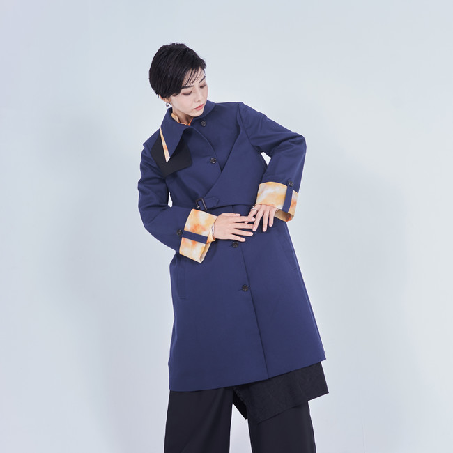 夕暮れ時の空のイメージから2種類のオリジナルプリント生地を制作。ブラックやネイビー、グレーなどシックな色合いと合わせ、落ち着きながらも遊びのある大人のスタイルを提案します。