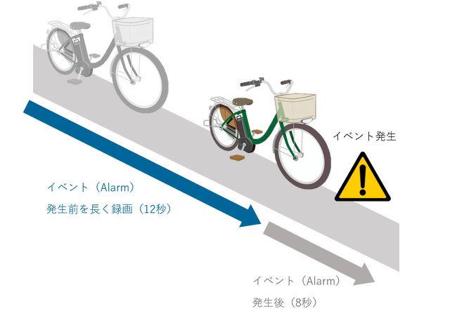 本製品は、電動アシスト自転車の利用環境にも適した機能を有し、「もしも」の際も、加速度センサーによって感知したイベント発生を瞬時に管理者へ通知、LTE回線を通じて映像をアップロード、専用アプリでの映像確認を実現し、電動アシスト自転車利用の更なる「安心・安全」を確立します。