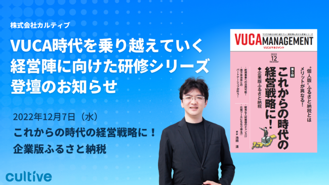 企業版ふるさと納税を活用した地域課題解決プラットフォーム「river(リバー)」を運用する株式会社カルティブ(本社:神奈川県横浜市、代表取締役:池田 清、以下「カルティブ」)は、2022年12月7日(水)に開催される「VUCA時代を乗り越えていく経営陣に向けた研修シリーズ」に当社の代表取締役の池田 清が登壇することをお知らせします。
