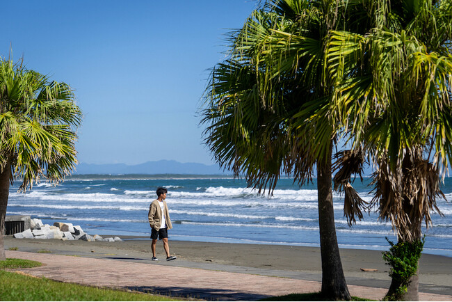 自社縫製工場は、宮崎県の観光地として知られる青島のリゾートホテル「ANAホリデイ・イン リゾート 宮崎」内にあります。サーフスポットの海まで3分という好立地で、従業員のワークライフバランスにも配慮。閉鎖的に見られがちな従来の縫製業のイメージ刷新にも取り組んでいます。