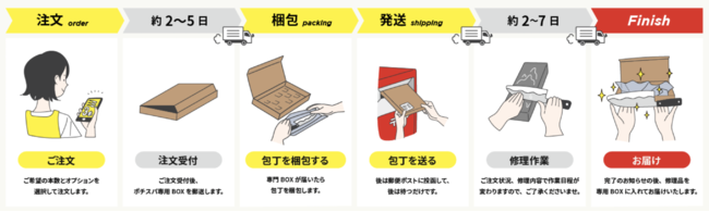 ポチスパとは、ネットでポチッと注文するだけで、専門の包丁職人があなたの包丁をスパッとした切れ味に研いでくれる、包丁研ぎ宅配サービスです。利用フローも以下の通りとても簡単で、注文後に発送されてくる箱に包丁を入れて送り返すだけ。これまでに50万本の修理実績がございます。