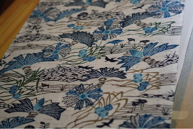 今年の展示会では、新たな染織り作家も追加され、涼やかな宮古上布や南風原花織が会場を彩ります。手織りの風合いを感じることのできるお洋服やストール、パネルやタペストリーなども新作が揃います。また、浴衣シーズンにぴったりのこの時期には、首里織や宮古織、紅型の半幅帯のお披露目も予定されています。