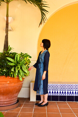 琉球藍で糸を染め、手機おりで丁寧に折り上げた生地で作られるワンピースやストールで、夏を涼やかに過ごせます。