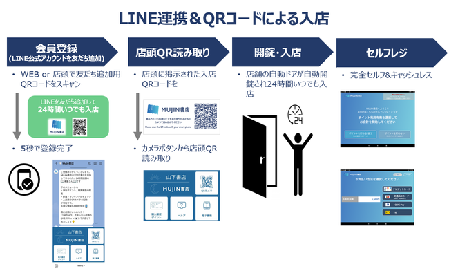 Nebraskaが開発した書店向けDXソリューション「MUJIN書店」を活用し、有人・無人をハイブリッドに組み合わせた24時間営業モデルの実証実験をトーハングループの山下書店世田谷店で行います。従来は営業時間外であった夜間・早朝の無人営業を可能とすることで、読者の利便性を高めて売上拡大を図ります。また、「MUJIN書店」は日中の有人時間帯でもオペレーションの効率化を支援し、スタッフの高付加価値業務への工数確保による顧客体験の向上に加え、近隣への商品配達やスタッフ食事休憩中の短時間の無人営業化など、働きやすさに配慮した柔軟な店舗運営形態を研究いたします。