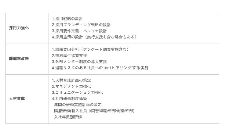 採用、育成、定着の3軸を総合的にサポートし、企業の組織に関する課題解決を多角的にご支援いたします。