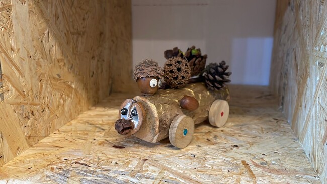 天然木を用いた「木のおもちゃ」制作の体験。バスやトラック、車に色を塗ったり、木の実デコレーションで特別なおもちゃを制作できるワークショップの紹介。(後日実施予定のワークショップに予約できます)
