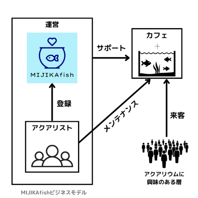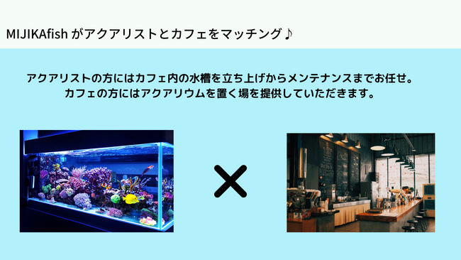 カフェはインテリアや癒しとしてアクアリウムを置くことができ集客に繋げられる。アクアリストは自己表現の場としてカフェにあるアクアリウムをメンテナンスすることで趣味の一歩先へ。普段はあまり関係のない業種をマッチングし、双方を盛り上げていける。そんなプラットフォームを提供します。