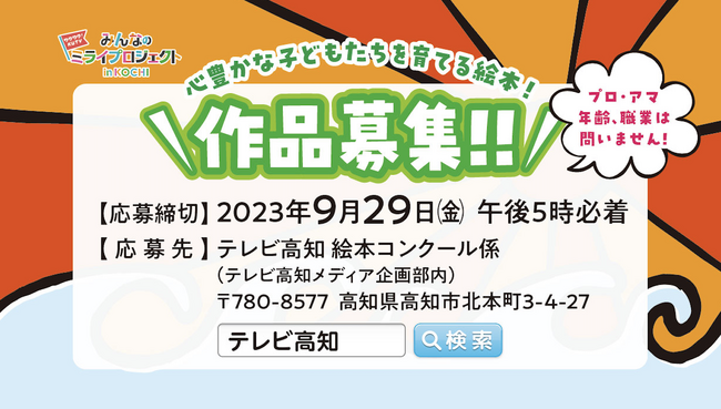 この度、テレビ高知では弊社が展開する「みんなのミライプロジェクト」の一環として、「第1回 テレビ高知絵本コンクール」を実施することになりました。この企画を通じて親と子の“ふれあい”の時間を作り、心豊かな子どもたちを育て、人と人とのつながりを深めることを目的としています。