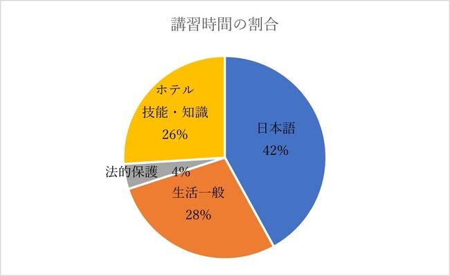 日本語などの法定講習のみならず、日本のおもてなしの心と文化を同時に学び、ホテルスタッフとしての心得や専門技術の習得を目指した内容です。ホテル技能・知識のプログラムにより一般的な法的講習時間と比べ長く設定し、200時間の充実したプログラムとなっています。