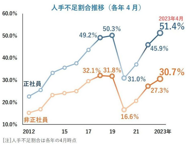 近年、観光業の発展と共にホテルや飲食業界の需要が増加しており、その需要に対応する優秀な人材の確保は、経営上の重要な課題となっております。2023年4月時点で、正社員不足を感じている企業は75.5%、非正社員 不足も78.0%と8割に迫る高水準となりました。(※1)
